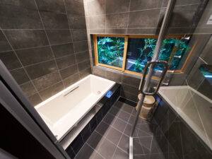 黒のタイルを基調をした清潔で洗練された浴室。インバウンドゲストも広々と利用可能。